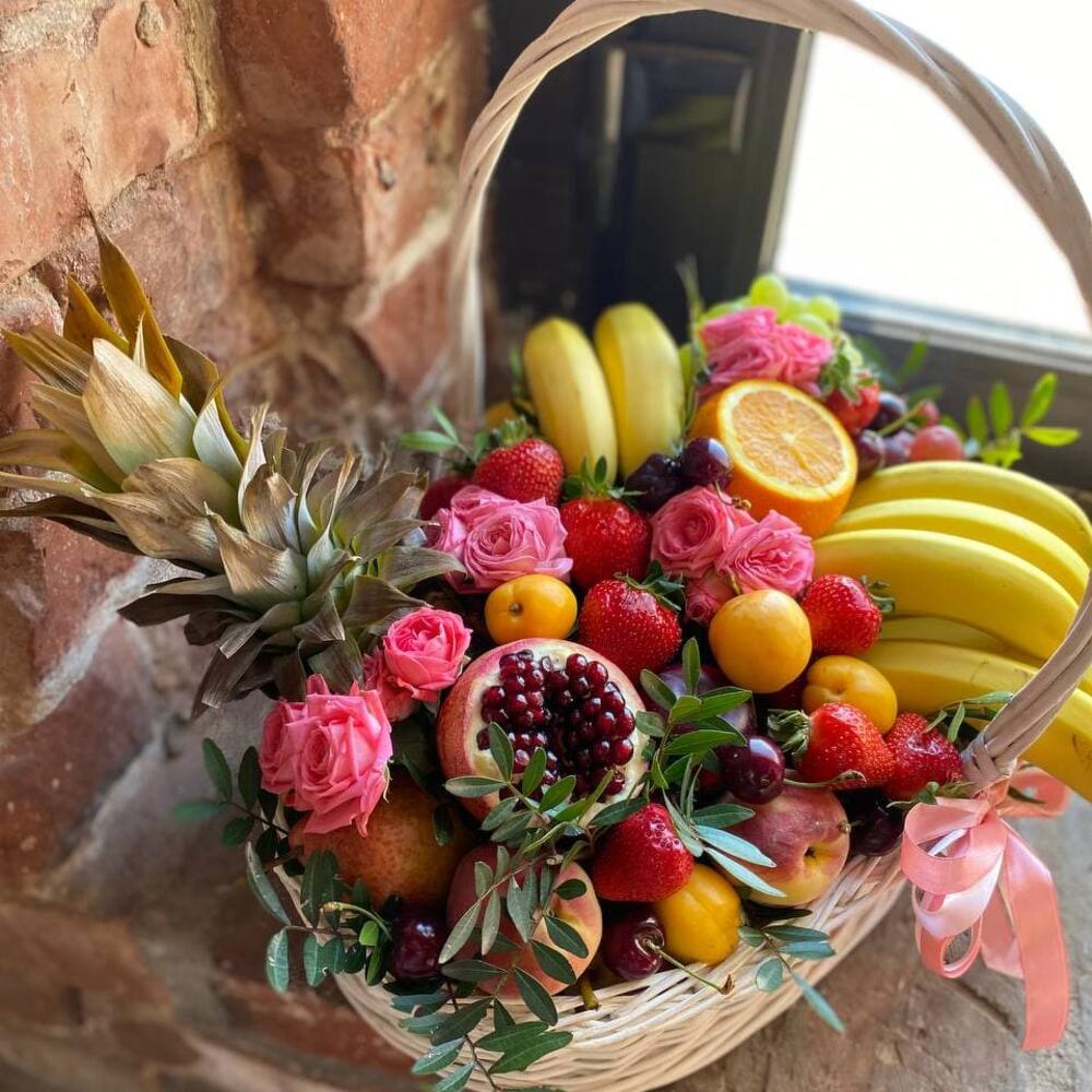 Огромная корзина с разнообразными сезонными фруктами – прекрасный подарок, который подойдет абсолютно для любого случая: спелые гранаты, яблоки и груши, ягоды, веточки эвкалипта и кустовой розы, здесь есть все, для того чтобы поднять настроение и зарядить позитивом