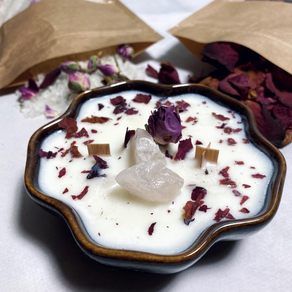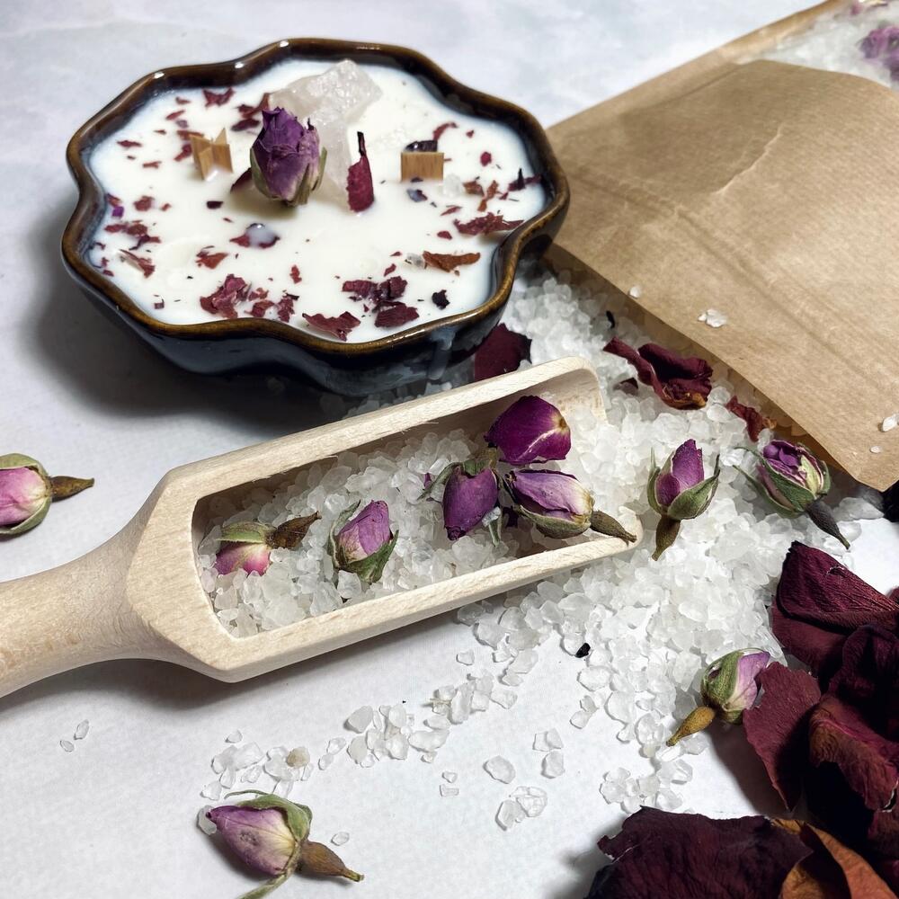 Лепестки роз – 20 гр.репродукция – 1 шт.бутоны китайской розы – 20 гр.розовый кварц – 1 шт.аромасвеча в керамике – 1 шт.природная морская соль – 350 гр.
