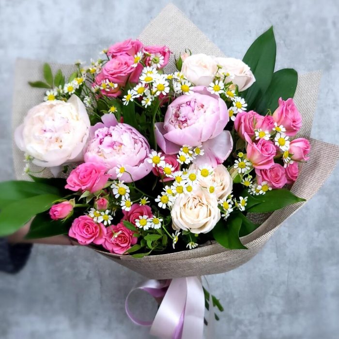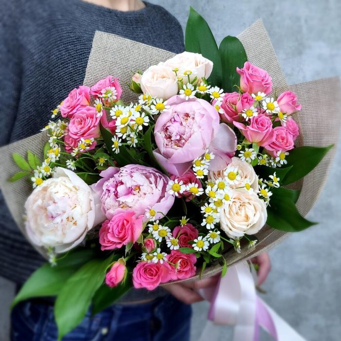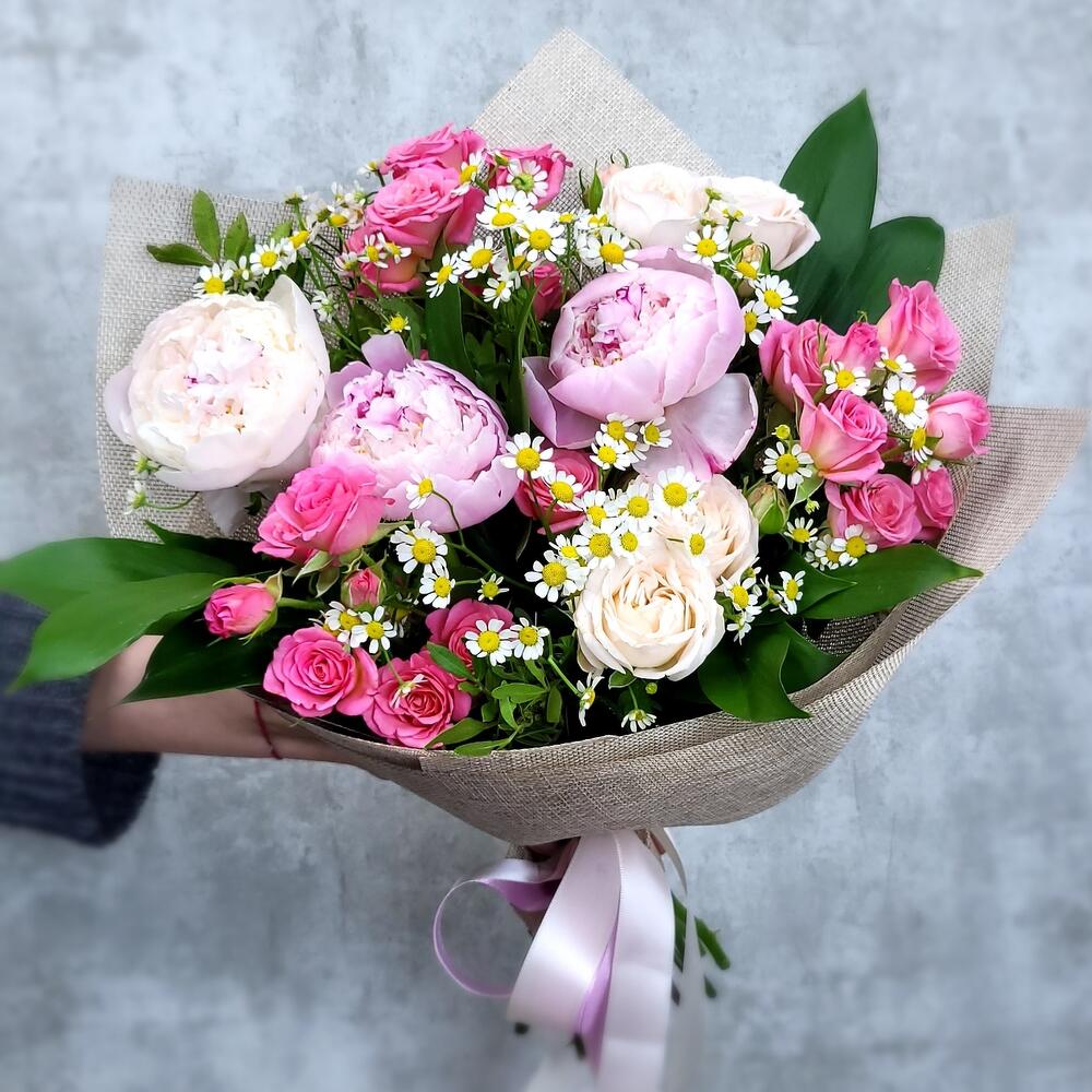 Сборный букет из пиона ,альстромерии и французской розы