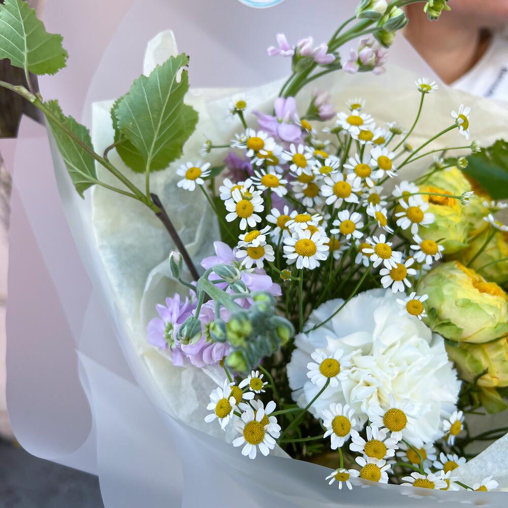 Полевой букет с ромашками, маттиолой , пионовидной розой