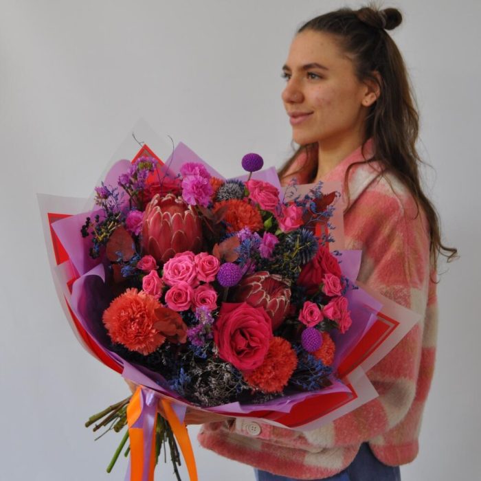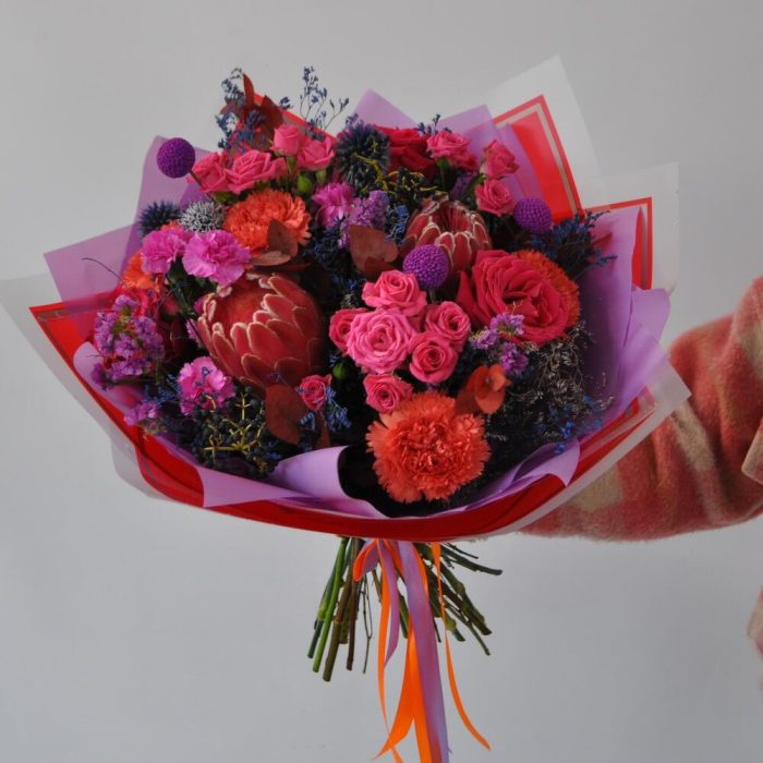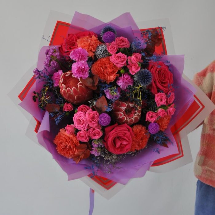 Протея и розы в ярком букете «Луна моей жизни»
