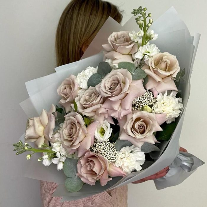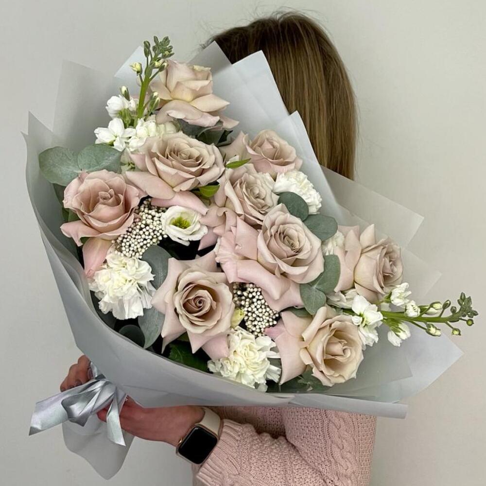 Альстромерии, Гвоздики, Кустовые розы, Лизиантусы, Розы, Хризантемы