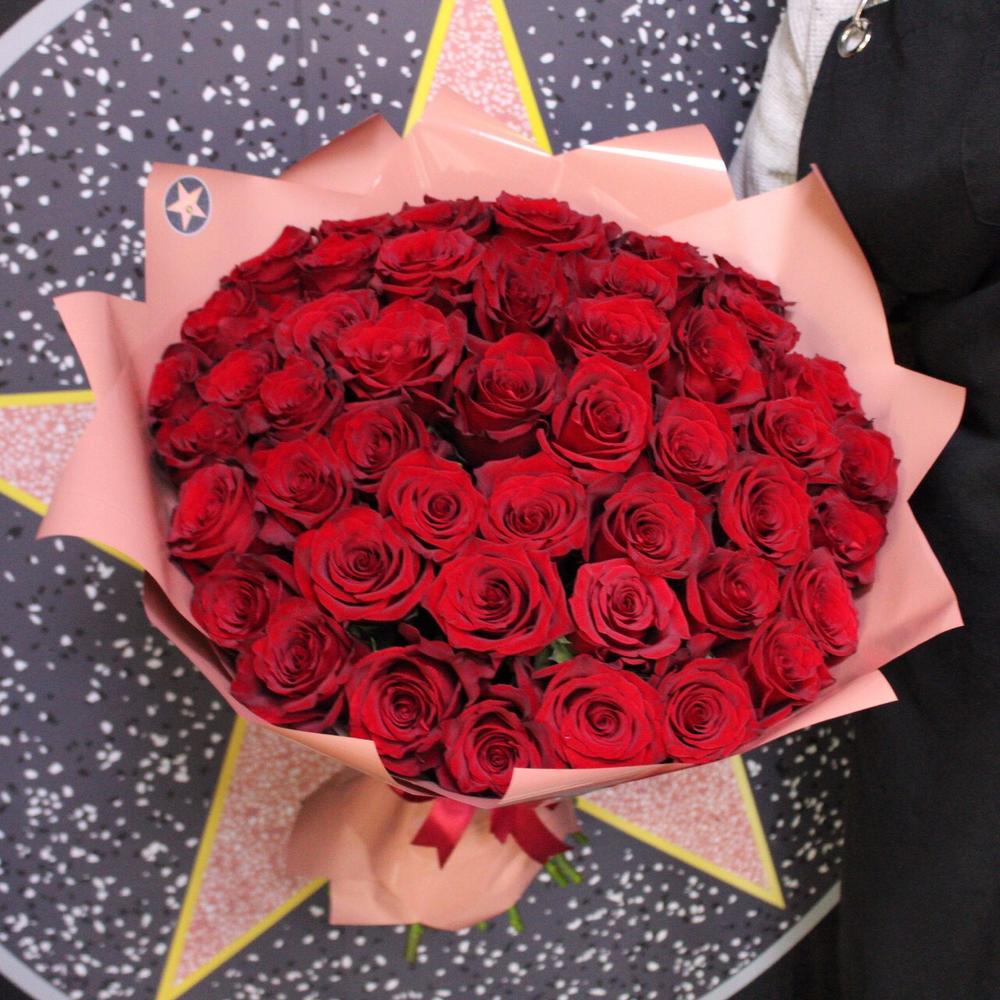 Роза Эксплорер – 51 шт.Пленка дизайнерская – 3 шт.Лента атласная – 2 шт.
