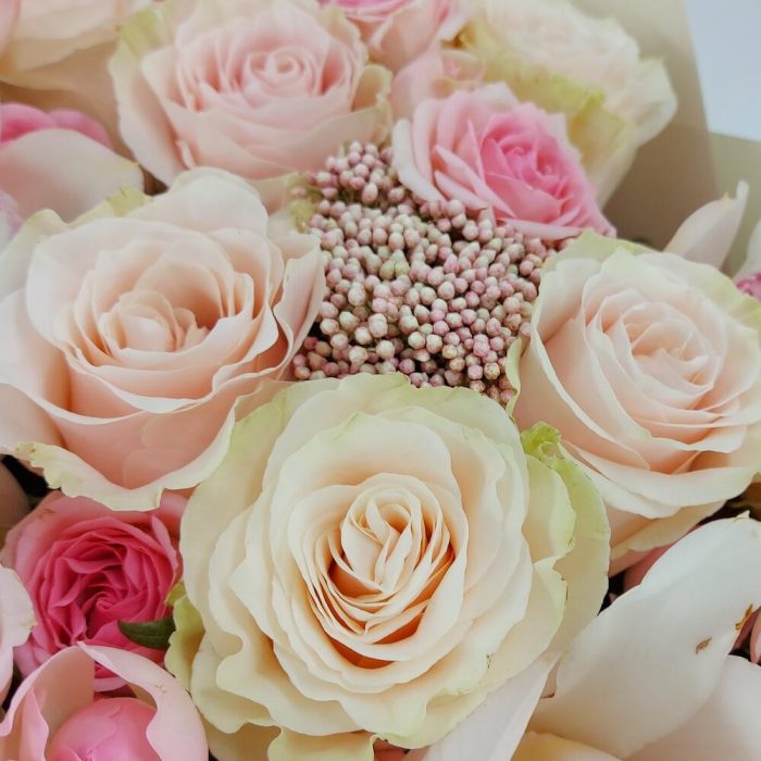 Роза кустовая Эквадор – 8 шт.Озотамнус розовый – 4 шт.Упаковка дизайнерская – 1 шт.Пистация – 10 шт.Роза Эквадор Премиум – 15 шт.Орхидея цимбидиум бутон – 5 шт.