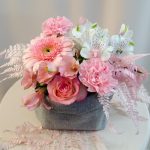 Альстромерия – 2 шт. Гвоздика – 2 шт. Гербера – 1 шт. Оазис – 1 шт. Фисташка – 2 шт. Мешочек – 1 шт. папоротник стабилизированный – 1 шт. Роза – 1 шт.