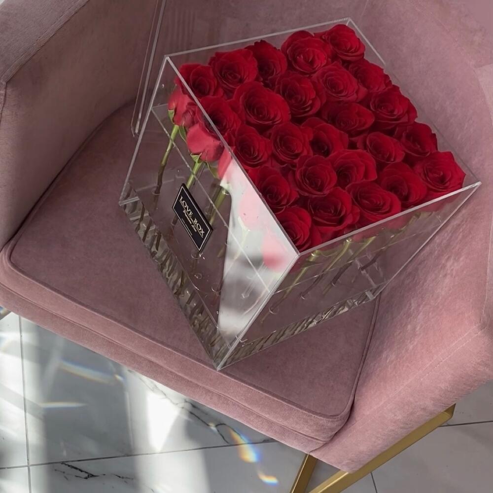 Роза Эквадор – 25 шт.Стеклянный куб – 1 шт.