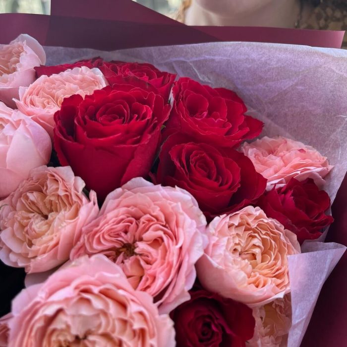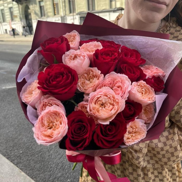 роза кения красная – 10 шт.роза пионовидных премиум джульетта – 5 шт.Лента атласная – 2 шт.Упаковка корейская пленка – 1 шт.