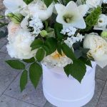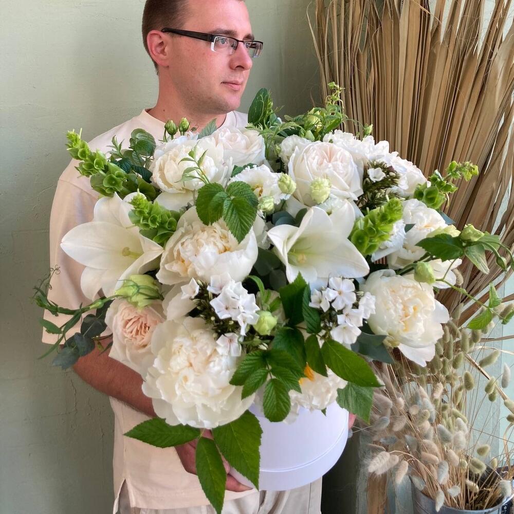лилия лонг – 3 шт.ирландский колокольчик – 5 шт.Роза пионовидная – 5 шт.Флокс – 5 шт.Лизиантус – 7 шт.Ветки малины – 5 шт.Маттиола – 7 шт.Эвкалипт – 5 шт.Пион – 7 шт.Коробка шляпная – 1 шт.Оазис флористический – 2 шт.
