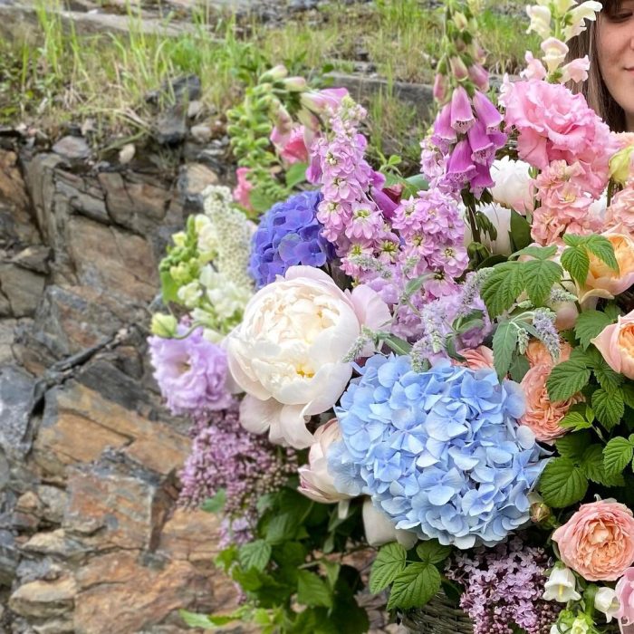 Садовая композиция с гортензиями, пионами, пионвоидными розами и колокольчиками