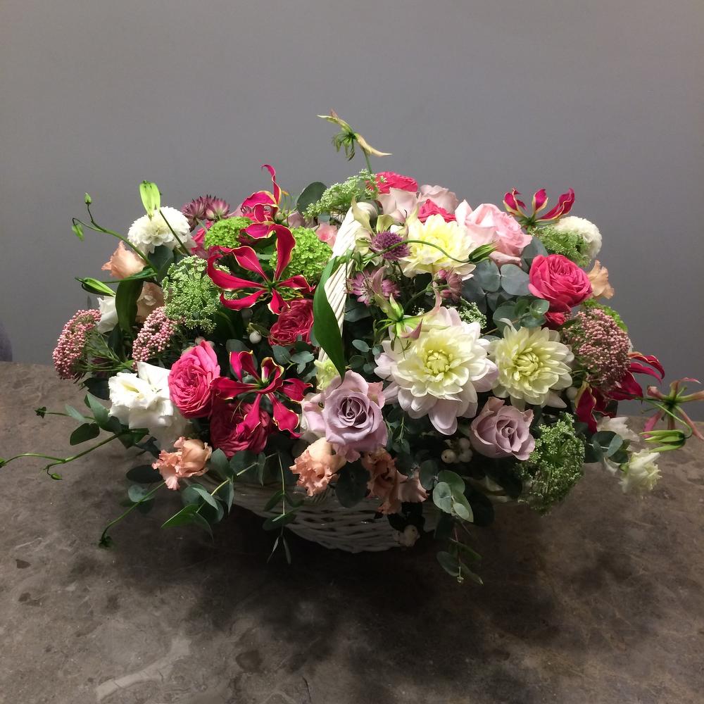 Роскошная садовая корзина с пионовидными розами, георгинами, астранцией, эвкалиптом и тропической глориозой.Стильное цветочное решение для любого случая.⠀Ширина корзины около 110 сантиметров, высота корзины около 90 сантиметров.