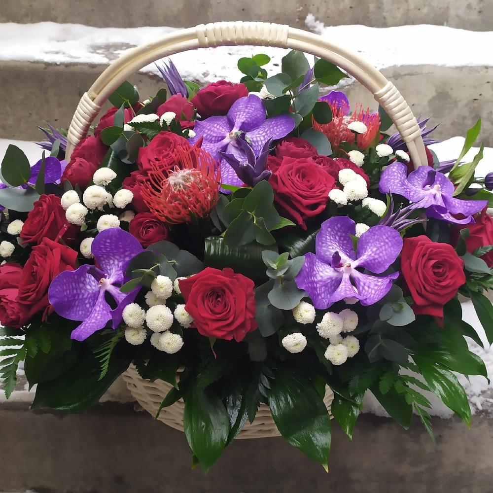 Роза – 15 шт.Роза кустовая пионовидная – 10 шт.Ванда – 7 шт.Клематис – 10 шт.Зелень – 30 шт.Корзина – 1 шт.Оазис – 5 шт.Хризантема кустовая – 10 шт.