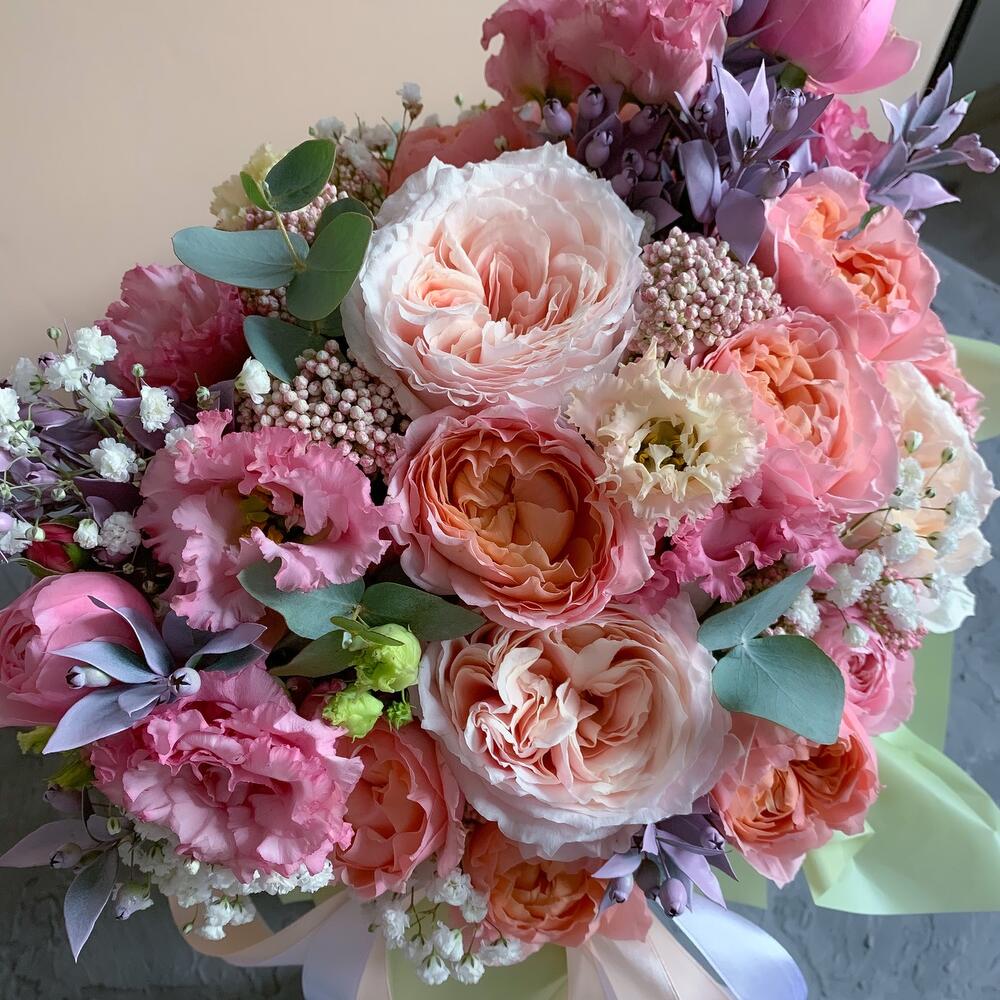 джульетта кустовая – 3 шт.Сильвия – 1 шт.тсумуги роза – 3 шт.Эустома – 3 шт.Озотамнус – 2 шт.Гипсофила – 1 шт.Эвкалипт – 1 шт.Диантус – 3 шт.зелень крашенная – 3 шт.Коробка шляпная – 1 шт.Упаковка дизайнерская – 1 шт.