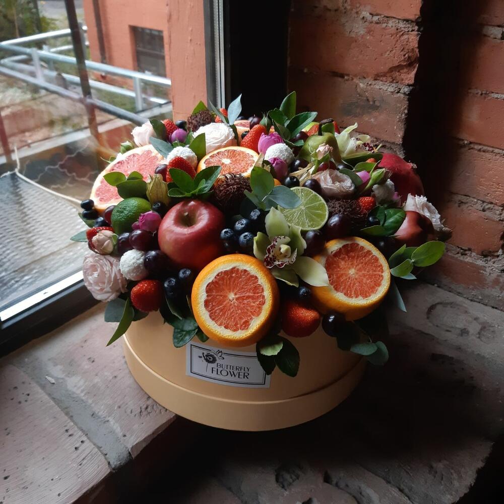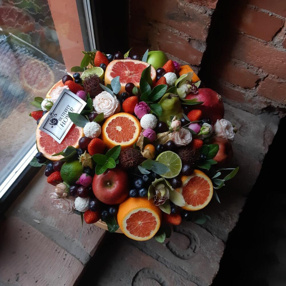 Клубника – 250 гр.Роза кустовая – 5 шт.Эвкалипт – 3 шт.Раффаэлло – 7 шт.Виноград – 150 гр.Гранат – 1 шт.Оазис – 2 шт.Яблоко – 2 шт.Лайм – 2 шт.Физалис – 3 шт.Груша – 1 шт.ЦИМБИДИУМ – 2 шт.Голубика – 150 гр.рамбутан – 150 гр.Грейпфрут – 2 шт.апельсин красный – 5 шт.коробка шляпная большая 32 см – 1 шт.