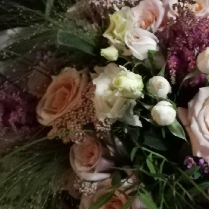 Ваксфлауэр – 6 шт. Вероника – 3 шт. Калла – 3 шт. Роза кустовая – 5 шт. Роза – 17 шт. Гвоздика – 3 шт. Берграсс – 6 шт. Паникум Фонтан – 4 шт. Оформление – 1 шт. Астильба Европа – 3 шт. Лизиантус – 4 шт.