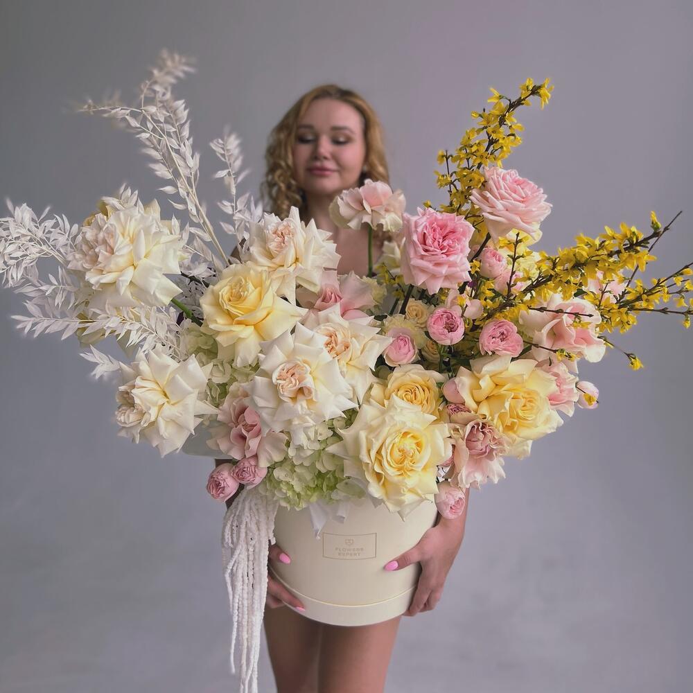 Гортензия – 2 шт.Роза – 19 шт.Кустовая роза – 7 шт.Сухоцветы – 9 шт.Шляпная коробка – 1 шт.Форзиция – 3 шт.