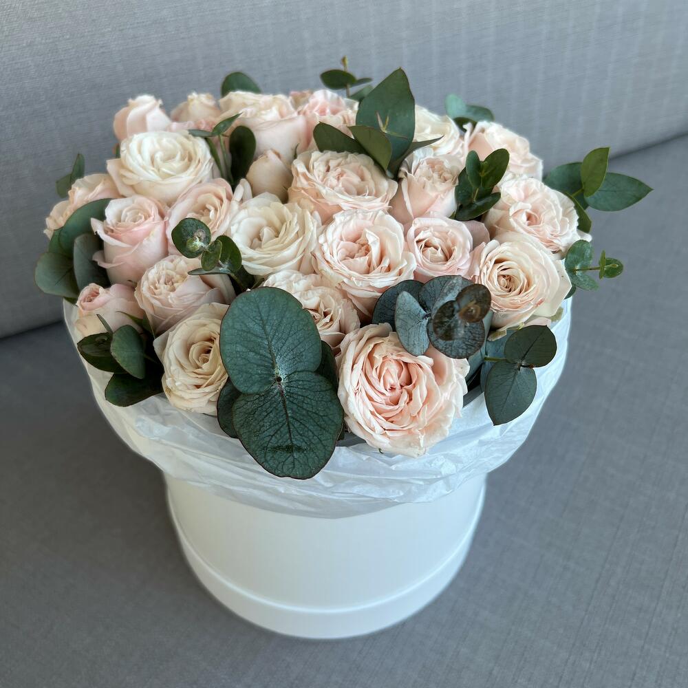 Кустовая роза – 7 шт.Эвкалипт – 4 шт.Шляпная коробка – 1 шт.