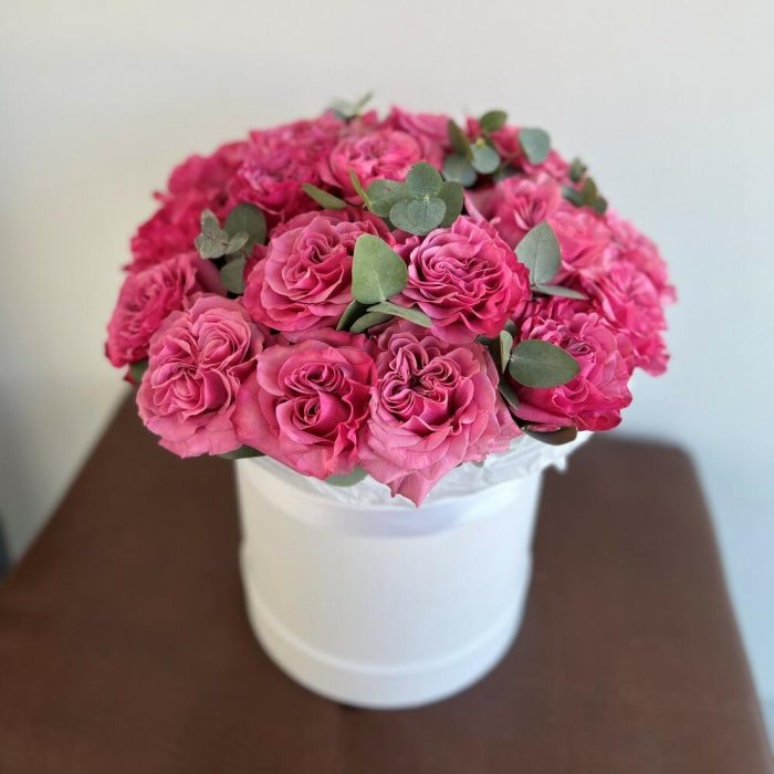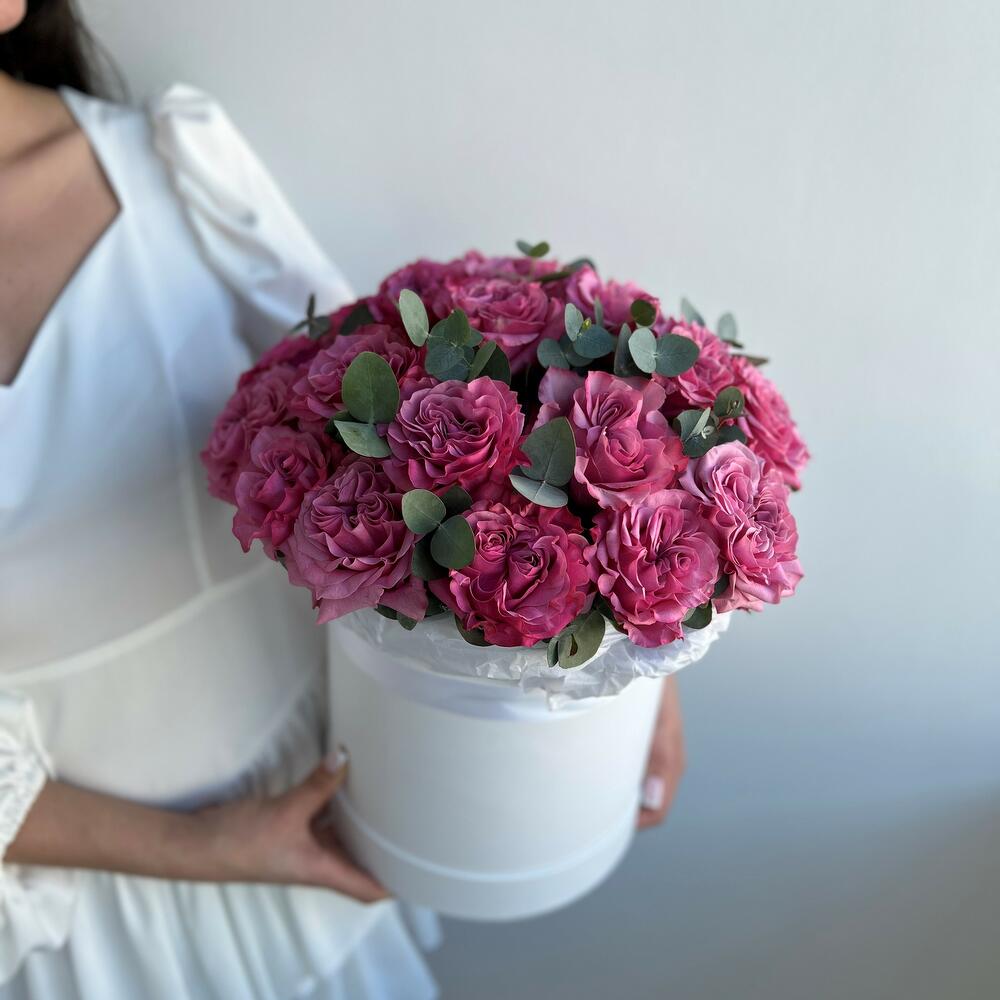 Шляпная коробка с фиолетовой пионовидной розой и эвкалиптом, 25 см в диаметре и 35 см высотой