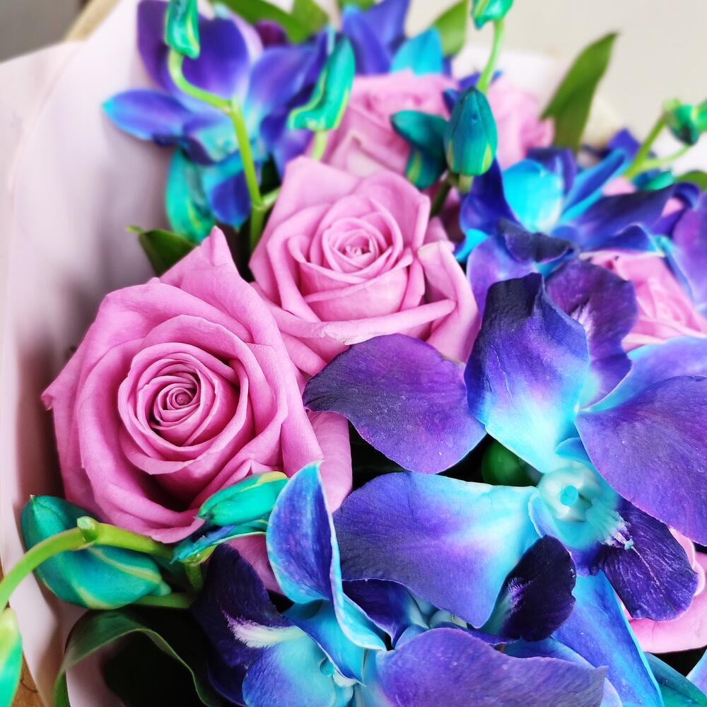 На фоне элегантных роз выделяется глубокий и невероятно красивый оттенок синих орхидей. Сочная зелень рускуса создаёт законченный образ данной композиции.Великолепный букет, который наши флористы с любовью соберут для Вас, символизирует изысканность и благородство, передает чувство восхищения и нежных эмоций, которые Вы непременно испытаете. Размер и вид этого букета подчеркнут Вашу щедрость.На языке цветов букет скажет о Вашей симпатии и надежде на дальнейшие отношения. Но и для подарка подруге, маме, дочке – это тоже отличный выбор!К каждому заказу прилагается инструкция по уходу за цветами + подкормка для цветов от мирового бренда Chryzal + любовь флориста. Мы искренне стараемся, чтобы у наших клиентов появилось желание купить следующий букет именно в нашем магазине.