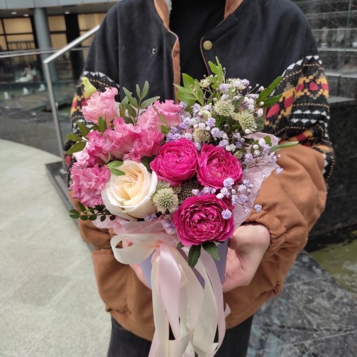 Лизиантус – 1 шт.Роза кустовая – 1 шт.Гипсофила – 1 шт.Астранция – 1 шт.Фисташка – 2 шт.Тишью – 1 шт.коробка 12*12 – 1 шт.