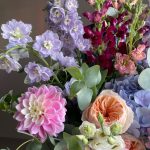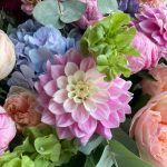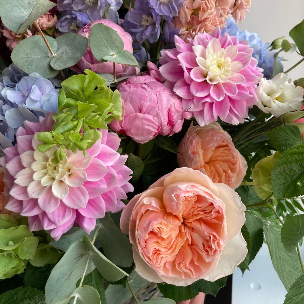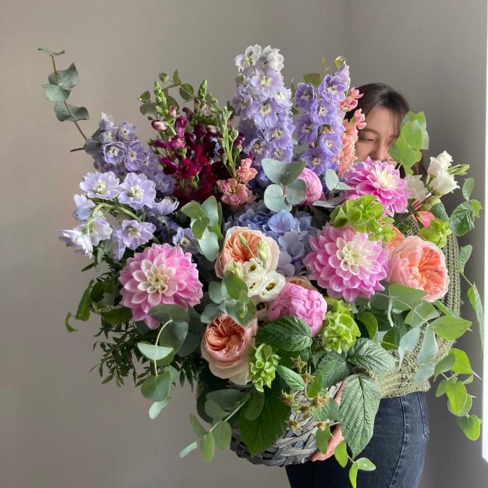 Тени в саду – Корзина с пионовидными розами, георгинами и дельфиниумом