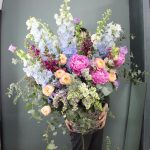 Дельфиниум – 5 шт.Львиный зев – 6 шт.Маттиола – 5 шт.Сирень – 6 шт.Пион – 5 шт.Роза пионовидная – 9 шт.Кампанула Лавандовая – 4 шт.Эвкалипт – 15 шт.Фисташка – 7 шт.Корзина – 1 шт.Оазис – 2 шт.