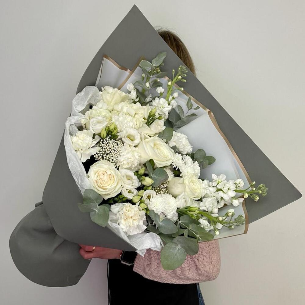 Гортензия – 1 шт.Роза Эквадор – 5 шт.Лизиантус – 2 шт.Маттиола – 4 шт.Озотамнус – 2 шт.Диантус – 5 шт.Сантини – 2 шт.Эвкалипт – 2 шт.Упаковка дизайнерская – 4 шт.