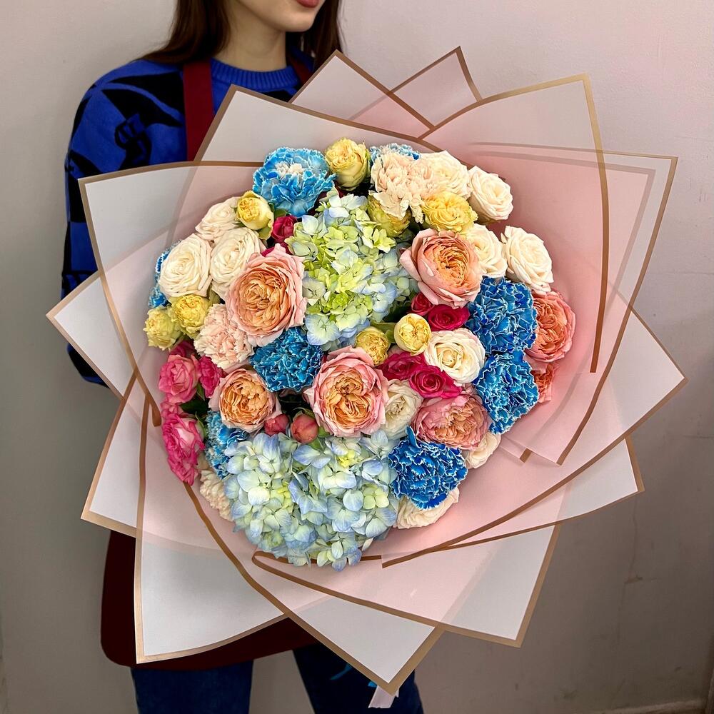 Гортензия – 2 шт.Диантус – 7 шт.Роза кустовая пионовидная – 7 шт.Упаковка дизайнерская – 1 шт.