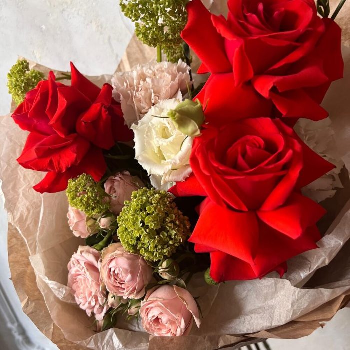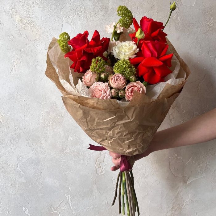 Роза – 4 шт.Вибурнум – 2 шт.Гвоздика – 2 шт.Лизиантус – 1 шт.Авторская упаковка – 1 шт.