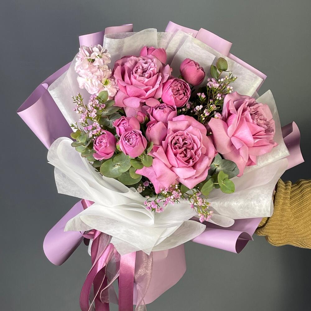 Ваксфлауэр – 1 шт.Лента – 2 шт.Маттиола – 1 шт.Эвкалипт – 1 шт.Роза одноголовая – 3 шт.Фисташка – 2 шт.Роза кустовая пионовидная – 2 шт.Упаковка дизайнерская – 1 шт.