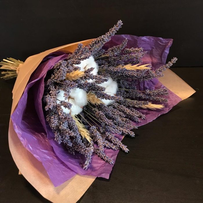 Лаванда сухоцвет – 1 шт.Хлопок натуральный – 3 шт.Колосья – 5 шт.Тишью – 1 шт.Крафт упаковка – 1 шт.бечевка натуральная – 1 шт.