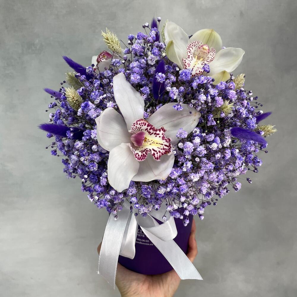 Гипсофила – 5 шт.Орхидея Цимбидиум – 3 шт.Оазис – 1 шт.Лагурус – 11 шт.Фаларис – 11 шт.Коробка d12 – 1 шт.