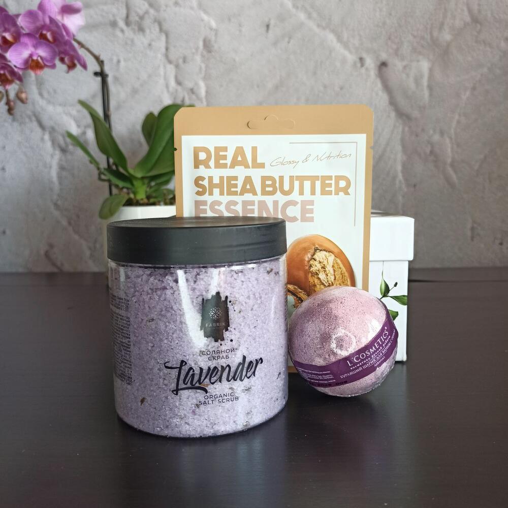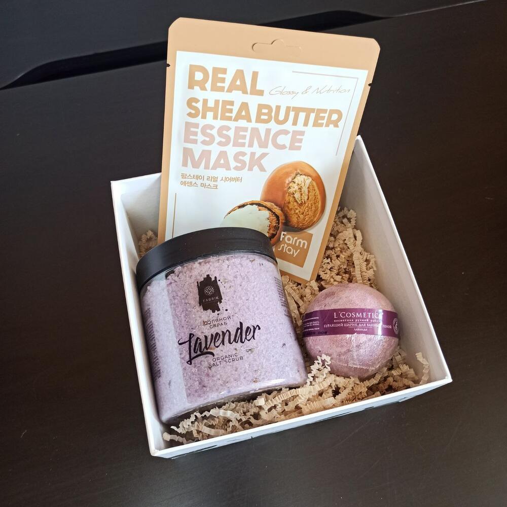 Подарочная коробка – 1 шт.тканевая маска для лица с маслом ши – 1 шт.соляной скраб для тела “лаванда” – 1 шт.бомбочка для ванной «лаванда» – 1 шт.