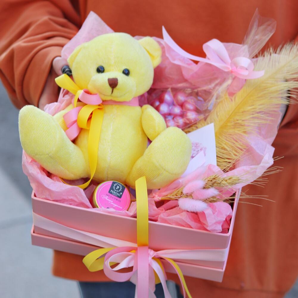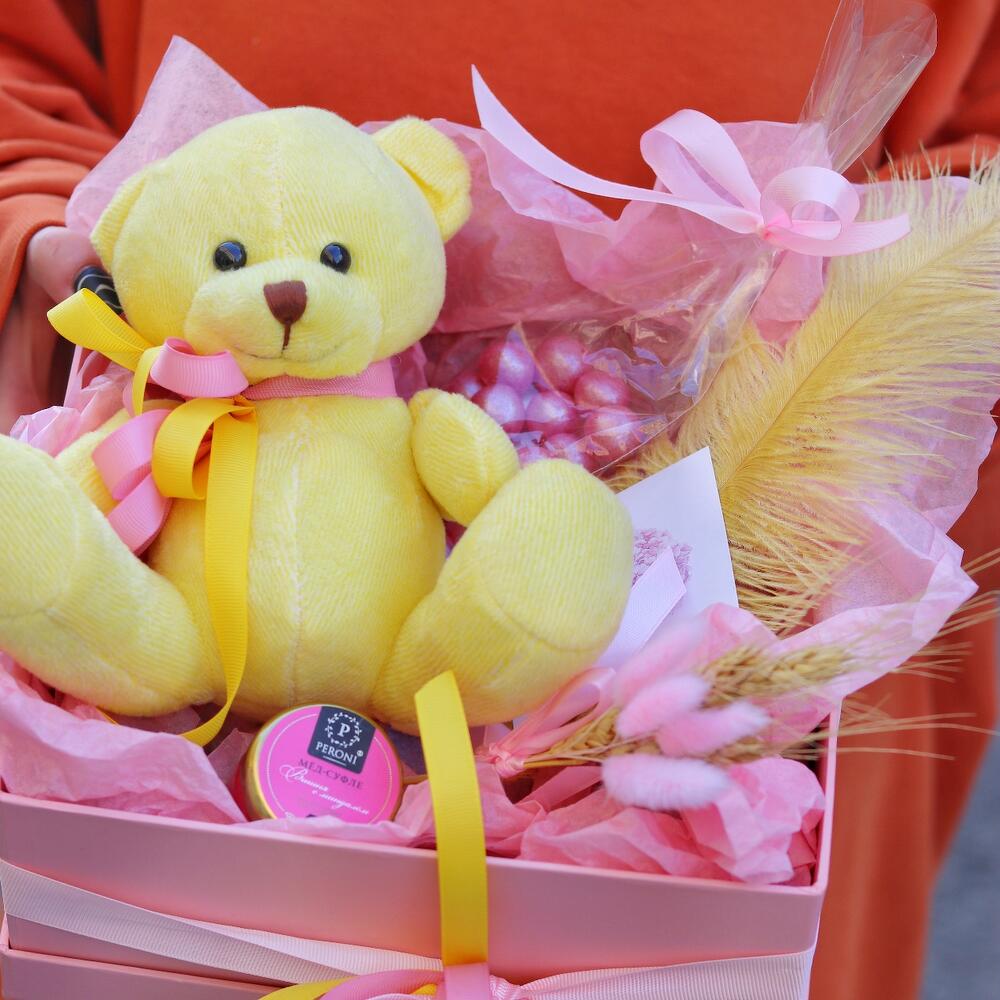 Мишка плюшевый – 1 шт.Мед-суфле – 1 шт.Открыточка с вашими пожеланиями – 1 шт.Драже – 1 шт.букет из сухоцветов – 1 шт.