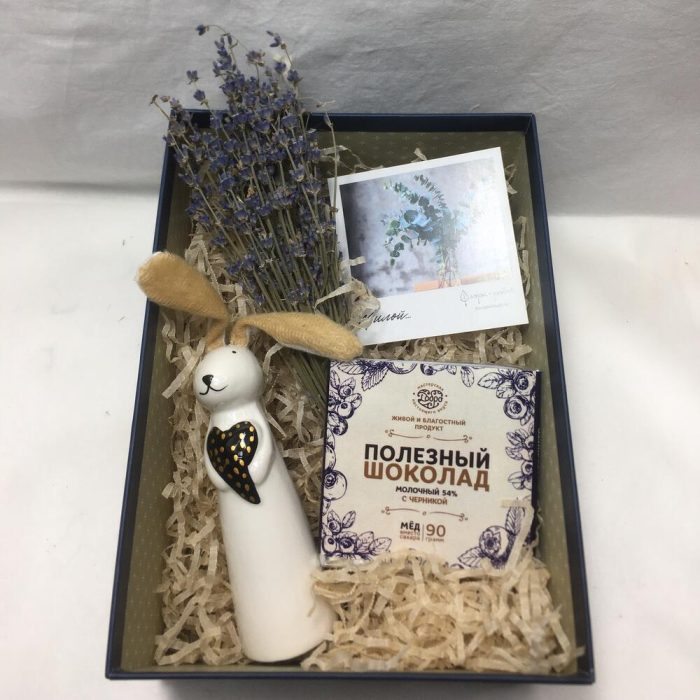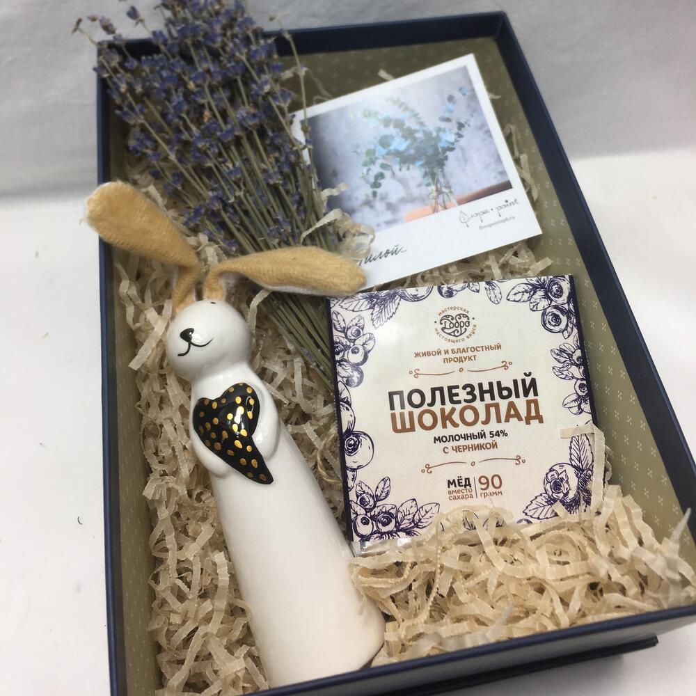 лаванда букет – 1 шт.фарфоровый заяц – 1 шт.полезный шоколад – 1 шт.Открытка – 1 шт.Коробка подарочная – 1 шт.