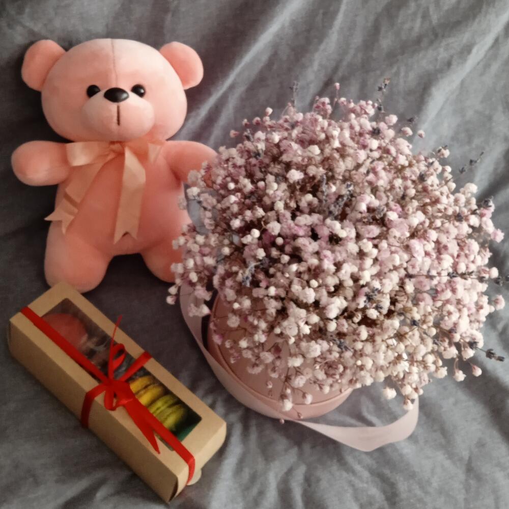 Гипсофила – 15 шт.Лаванда (сухоцвет) – 25 шт.Шляпная коробка – 1 шт.Подарочный пакет – 1 шт.макарон (пирожное) – 6 шт.мишка плюшевый 23 см – 1 шт.