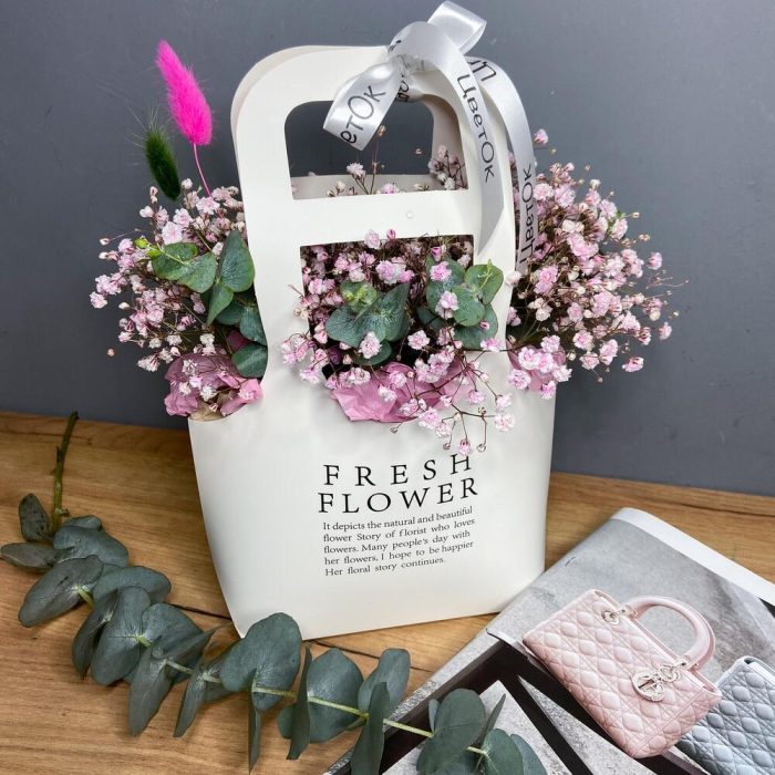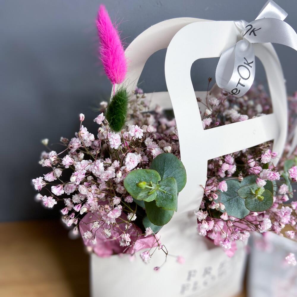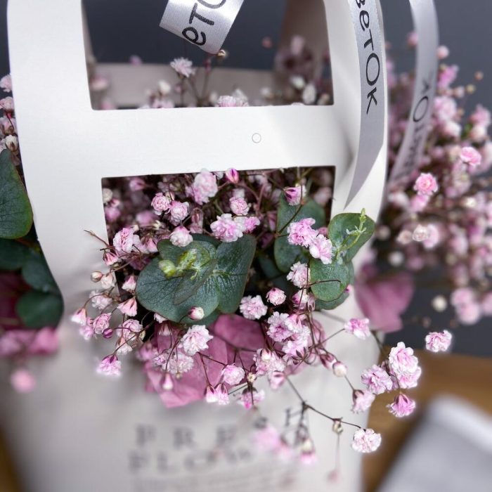 Очаровательная сумочка с розовой гипсофилой,веточками эвкалипта и лагуруса выразит ваши самые тёплые,нежные чувства И будет долго радовать свою получательницу