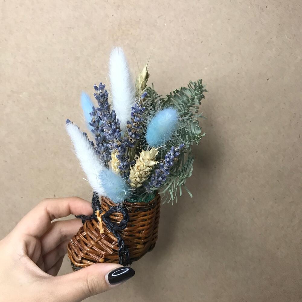 Лагурус (сухоцвет) – 6 шт.нобилис (ель голубая) – 1 шт.Лаванда – 9 шт.Корзина плетеная – 1 шт.