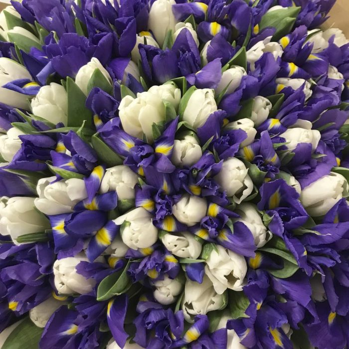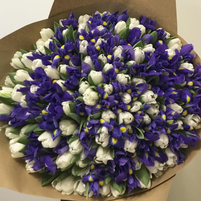 Букет из ирисов и тюльпанов “White Blue”