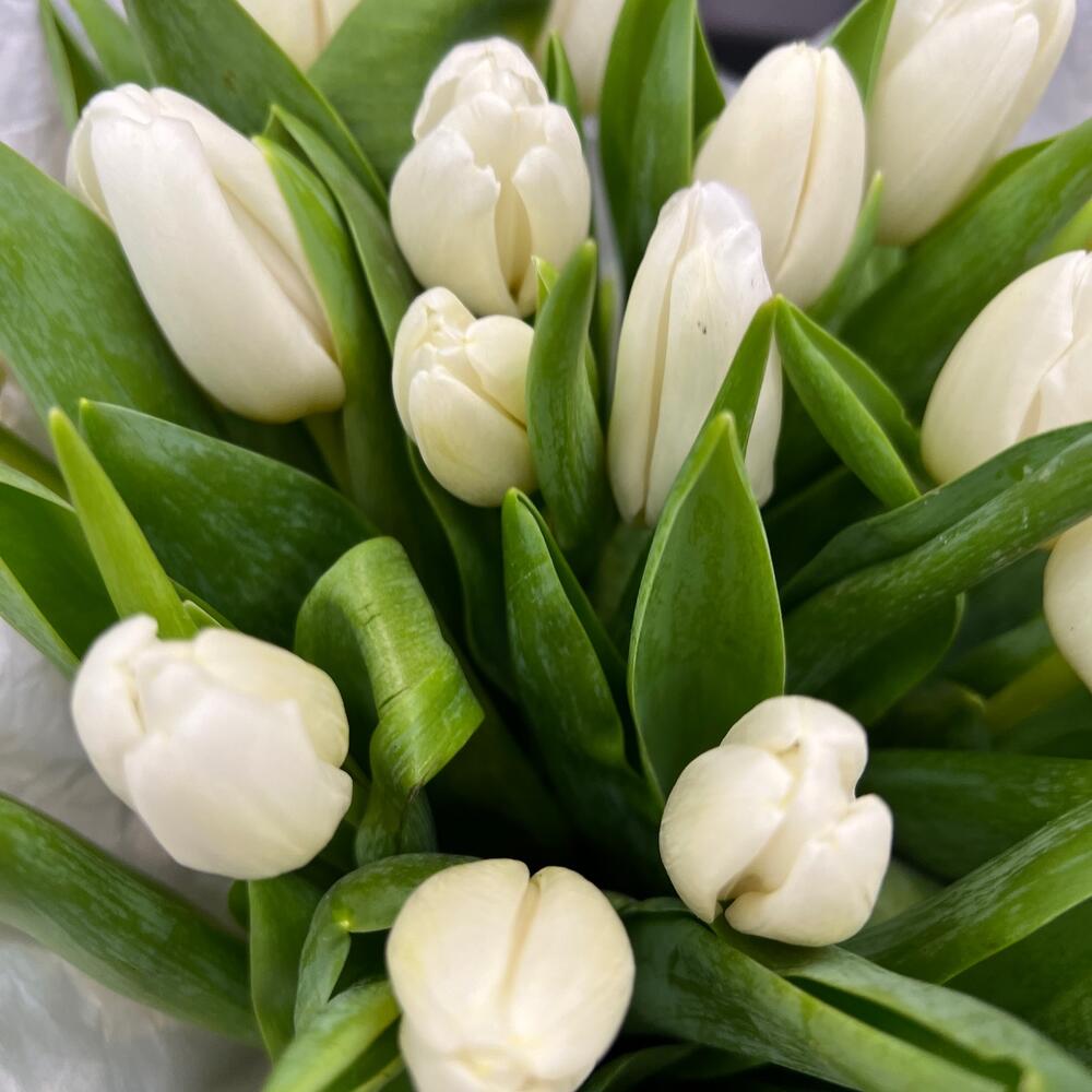 Лента атласная – 2 шт.Тюльпан белый – 25 шт.Пленка матовая – 2 шт.Тишью белое – 2 шт.