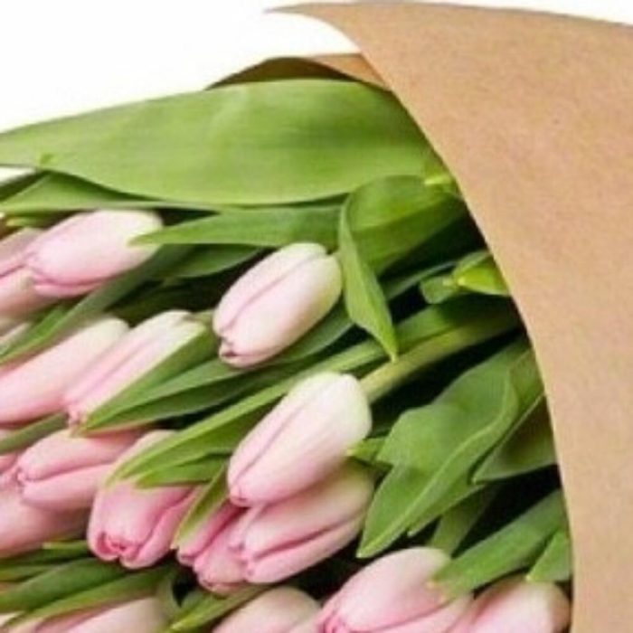 Тюльпан – 25 шт.Лента атласная – 1 шт.Крафт упаковка – 1 шт.