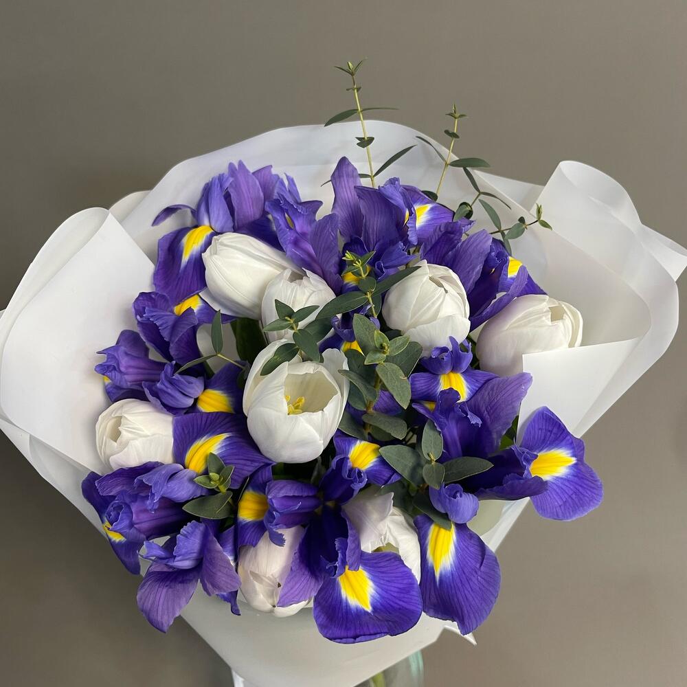 инисы синие – 13 шт.Тюльпан – 8 шт.Эвкалипт – 1 шт.впаковка дизайнерский – 1 шт.Лента атласная – 1 шт.