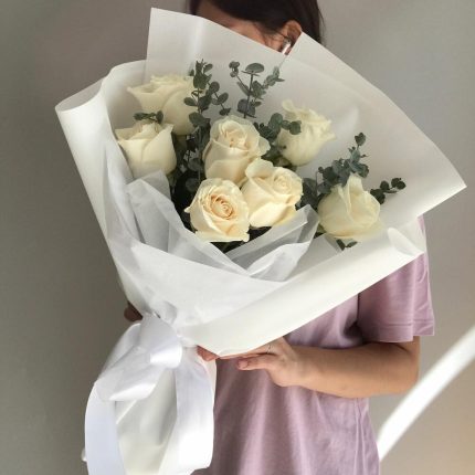 Белые розы 7 шт с эвкалиптом