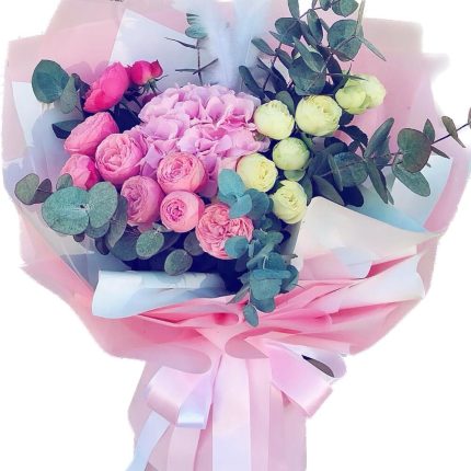 Коробка Робкий поцелуй из роз сорта квинси, охара, эустомы, генисты и диантуса