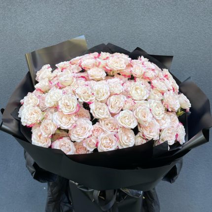 Тени в саду – Корзина с пионовидными розами, георгинами и дельфиниумом