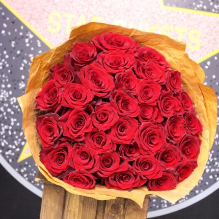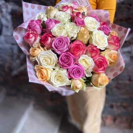 Букет из гортензии, хризантемы, гвоздики, оксипеталума и роз в стильной упаковке “Ласковый ветерок”